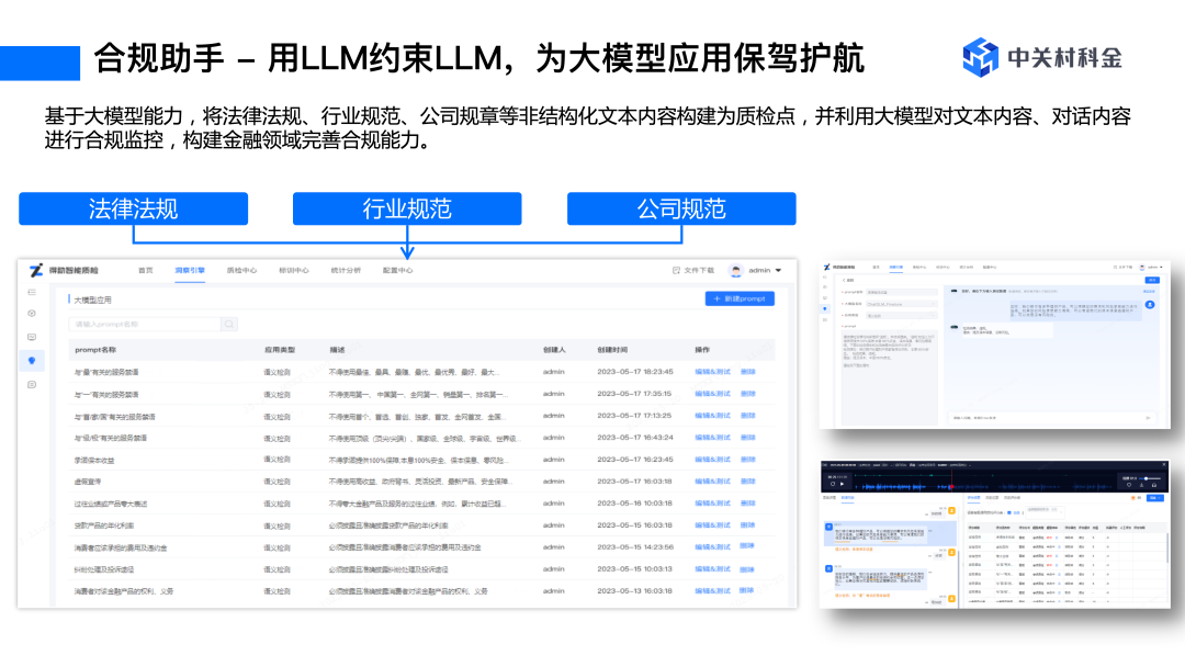 如何为理财师守好合规关口,利用前沿的大模型技术规避风险?中关村科金合规助手可以嵌入机构内部内容整合平台,在客户向理财师提问时,将法律法规、行业规范、公司规章等非结构化文本内容构建为质检点,对文本内容、对话内容进行合规监控,帮助理财师合规展业。