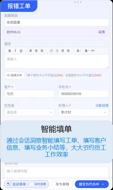 智能生成与精准路由。机器人支持自动抓取故障类型、故障内容和紧急程度生成结构化工单(平均预填率≥50%,平均准确率≥90%);工单按照工作流和流程触发器灵活流转,保证工单得到高效处理和解决;