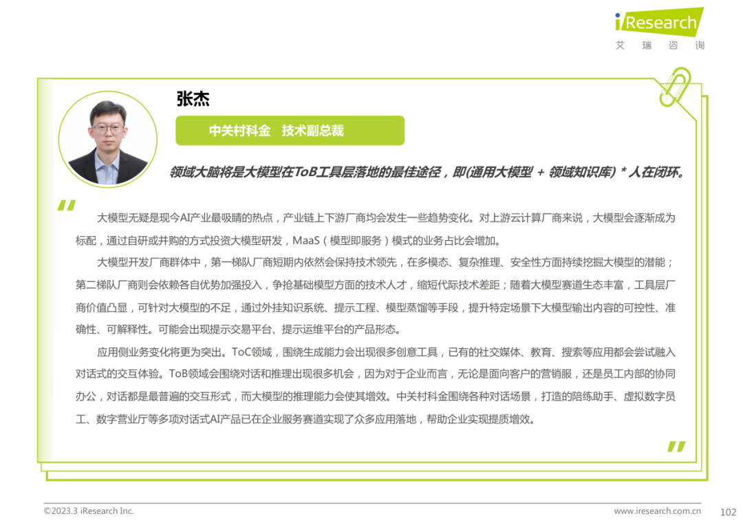 在报告产业发展趋势探讨部分,艾瑞特别邀请了阿里云、科大讯飞、中关村科金、武汉人工智能研究院等国内明星厂商及科研院所,分享对我国人工智能产业技术变革、赛道动态及未来趋势展望的见解。