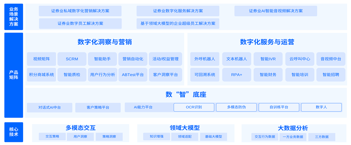 依托中关村科金多模态交互、领域大模型、大数据分析三大核心技术,及数智底座、数字化洞察与营销、数字化服务与运营三大产品矩阵,覆盖客户经营、客户服务、企业运营等多个业务场景,助力证券业数字化转型。
