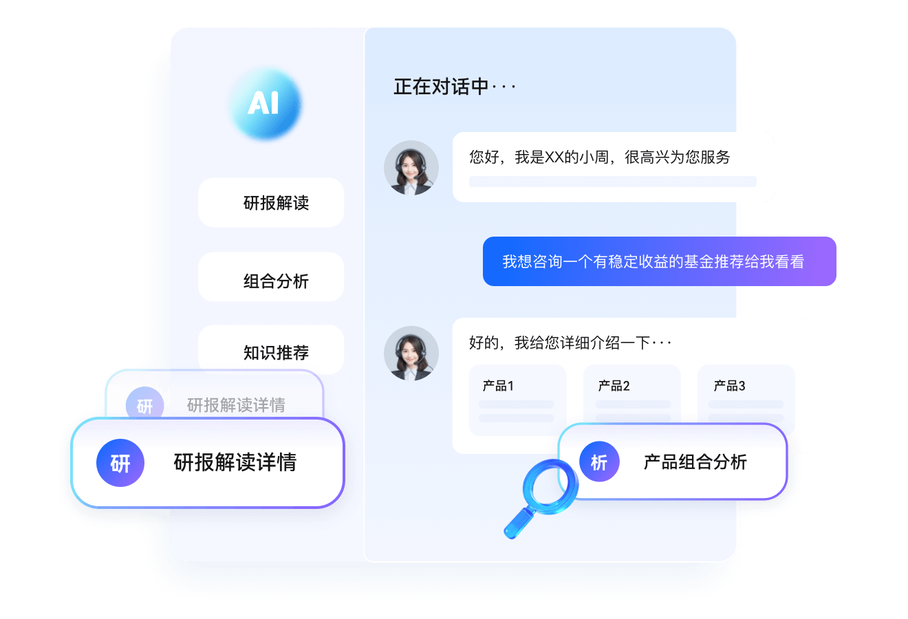 - 在投资与配置阶段,基于客户画像与风险偏好,提供自动化风险测评、资产配置分析与产品解读,辅助投顾高效输出专业、合规的一致化建议。