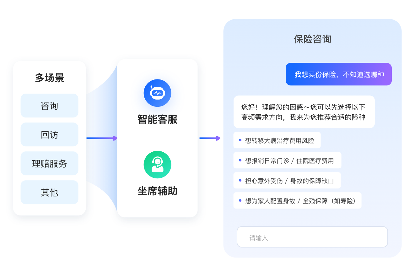 - 在保单服务与理赔阶段,通过智能客服与自动化回访能力,覆盖续期提醒、保单回访、保全办理与理赔咨询等场景;辅助客服高效处理复杂问题,提升响应速度与客户满意度