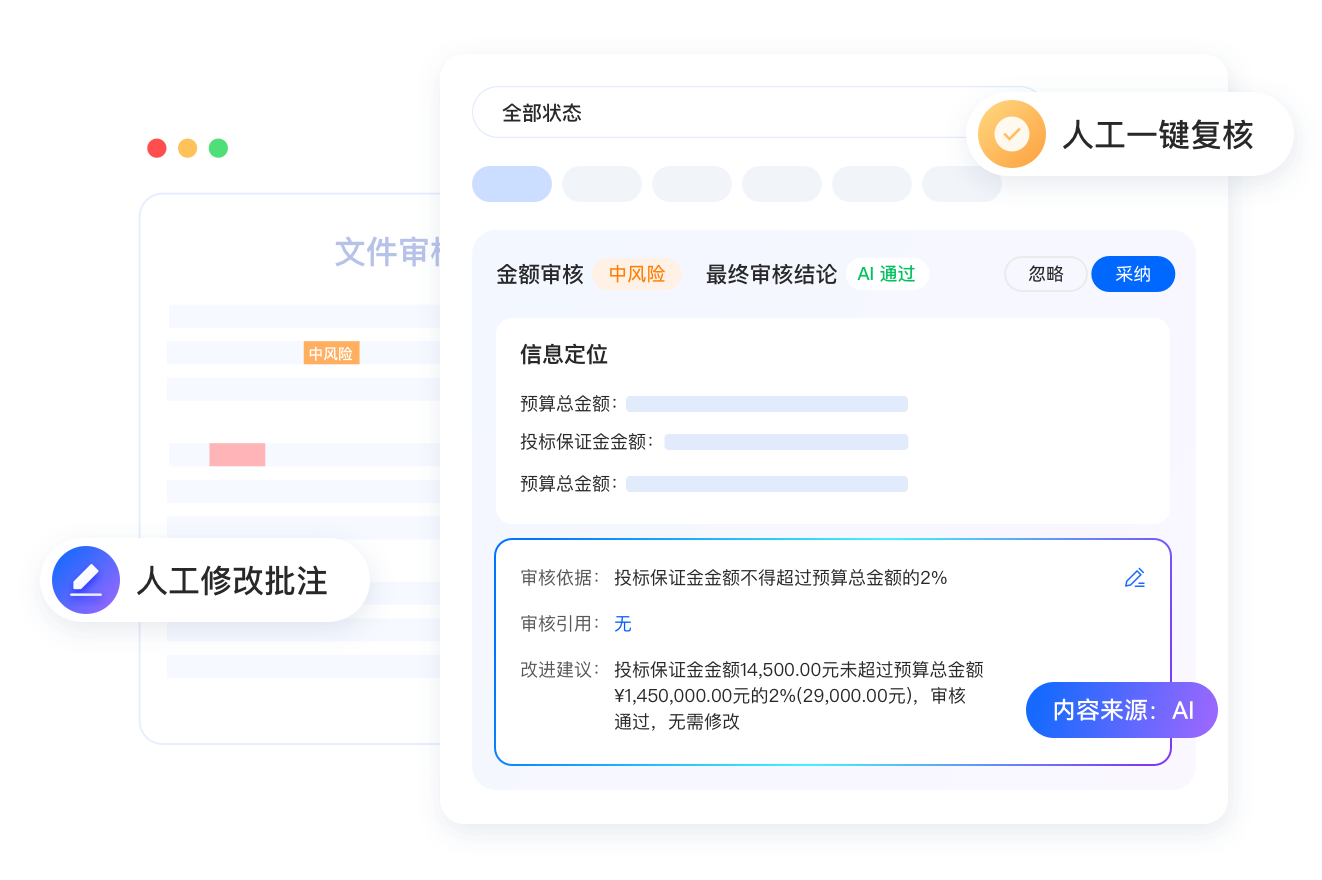 机器完成初审并输出结构化审核结果,人工可一键复核确认或修改批注